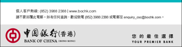 If you do not wish to receive future promotional emails from BOCHK and BOC Credit Card (if applicable), please click here. No fee will be charged for this arrangement.