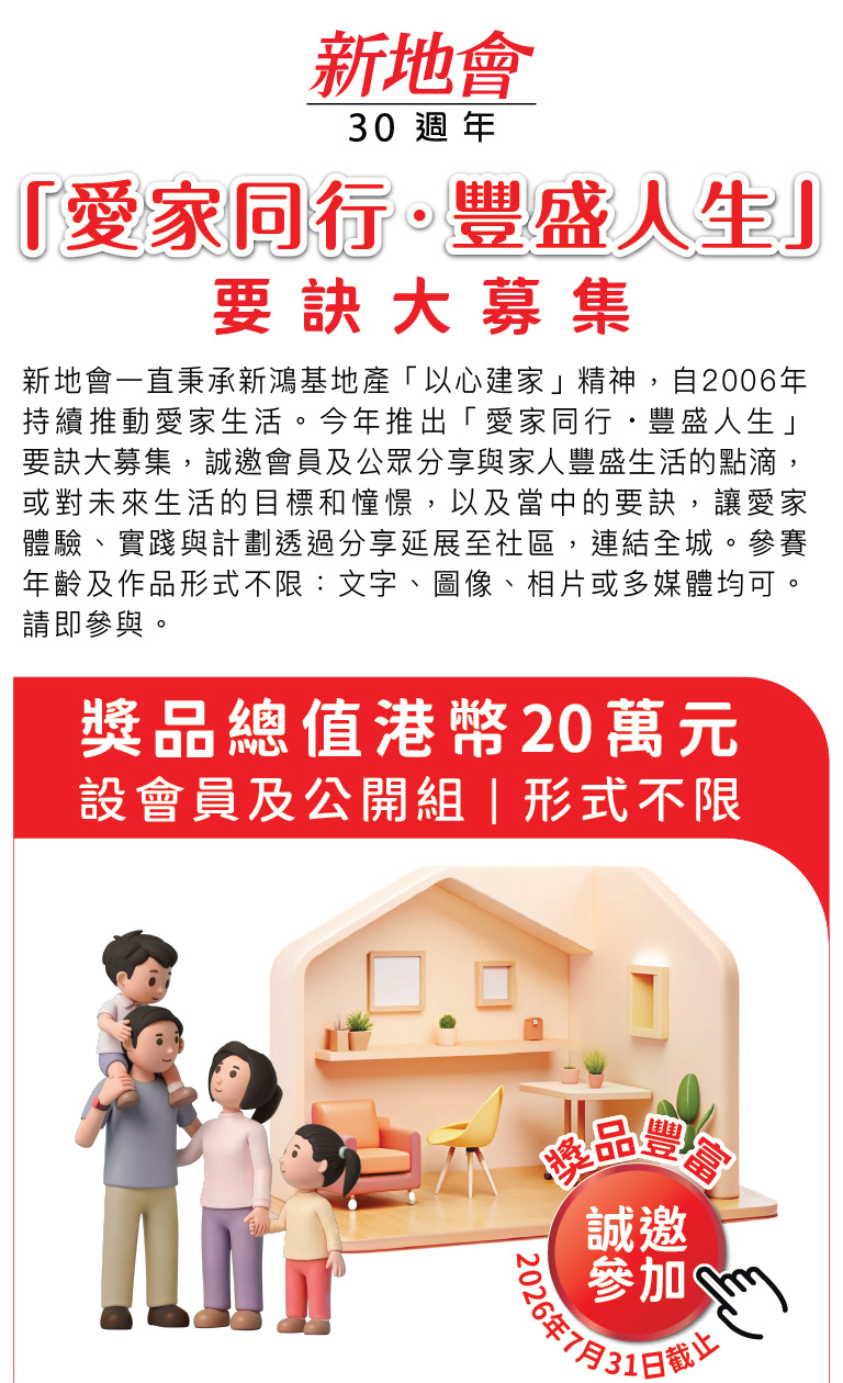 誠邀您參加新地會「愛家同行‧豐盛人生」要訣大募集 | 豐富獎品總值港幣20萬元