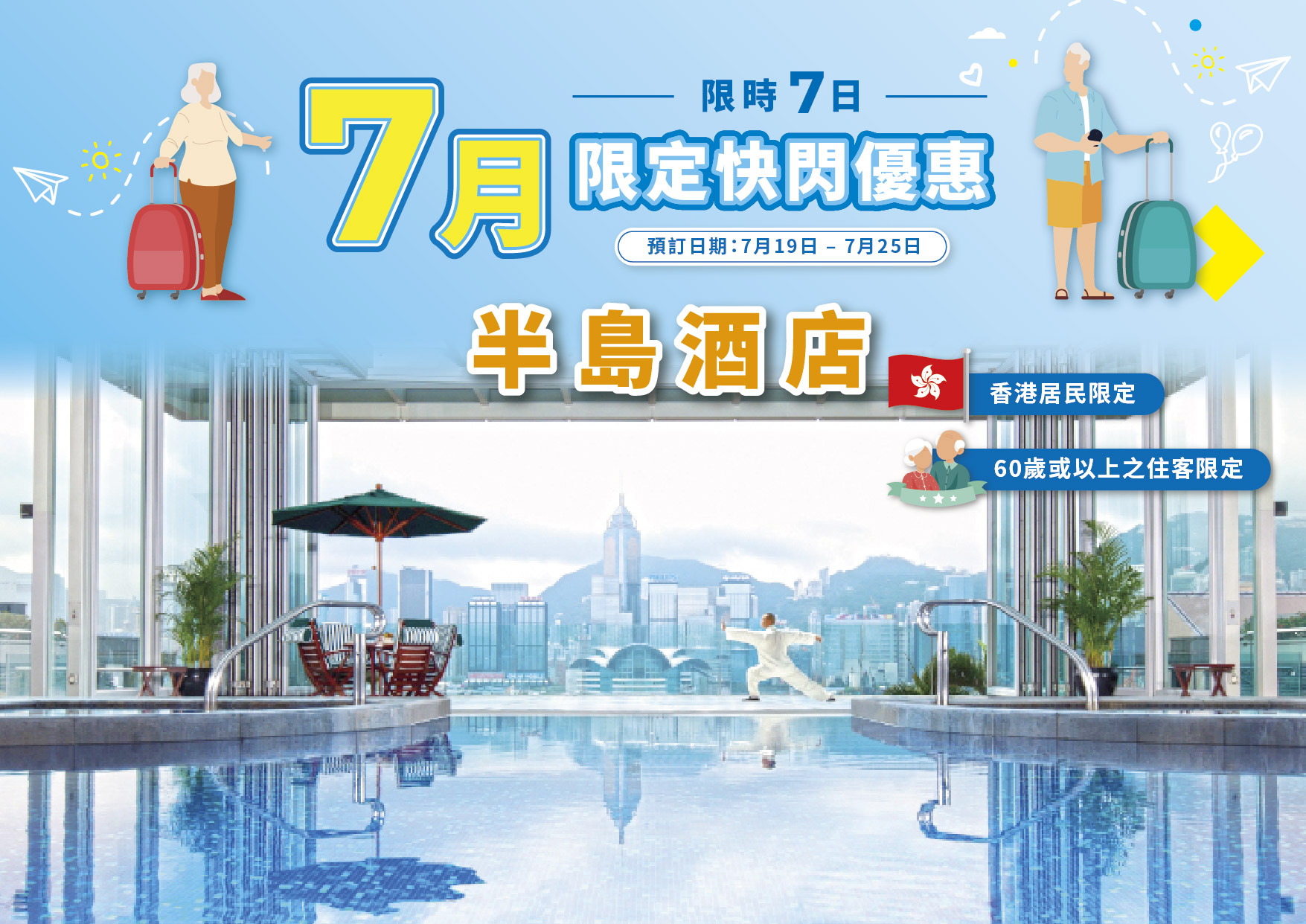 | 半島酒店:只限持有效香港身份證之香港居民預訂;須包括至少一名年滿60歲或以上之客人入住;酒店提供之午餐必須於入住日享用,客人並須於享用午餐前到前台辦理入住手續︱*所有體驗每天名額有限「先到先得」,並視乎預約的名額供應而定︱^免費房種升級只適用於星期日至五入住之訂單及僅提供雙人床;不包含貴賓廊服務;數量有限,先到先得︱產品內容及其價格均視乎特定等級或類別的供應情況而定︱以上價格只供參考,一切以報名時為準︱價格如有更改,恕不另行通知︱優惠受條款及細則約束︱圖片只供參考,如對服務質素有任何意見,歡迎發電郵至suggestion@texpert.com |