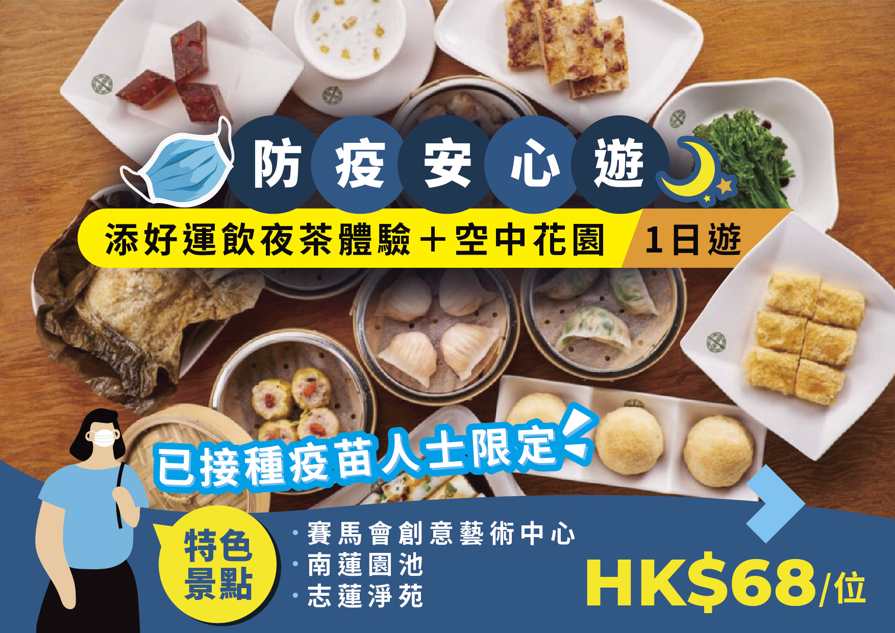 添好運飲夜茶體驗+空中花園:參加者必須已完成接種第一劑2019冠狀病毒疫苗,參與活動時工作人員將會查核其接種紀錄︱專業旅運旅行團:*2-6歲兒童可免費享用,7-11歲兒童需以成人半價優惠享用,費用於酒店現場支付;準確集合及出發時間於出發前一天下午4時後由領隊通知;另請嘉賓於出發當日提早15分鐘到達集合地點,逾時不候;以上價格以二人一房計算並須最少兩位成人同行︱產品內容及其價格均視乎特定等級或類別的供應情況而定︱以上價格只供參考,一切以報名時為準︱價格如有更改,恕不另行通知︱優惠受條款及細則約束︱圖片只供參考,如對服務質素有任何意見,歡迎發電郵至suggestion@texpert.com