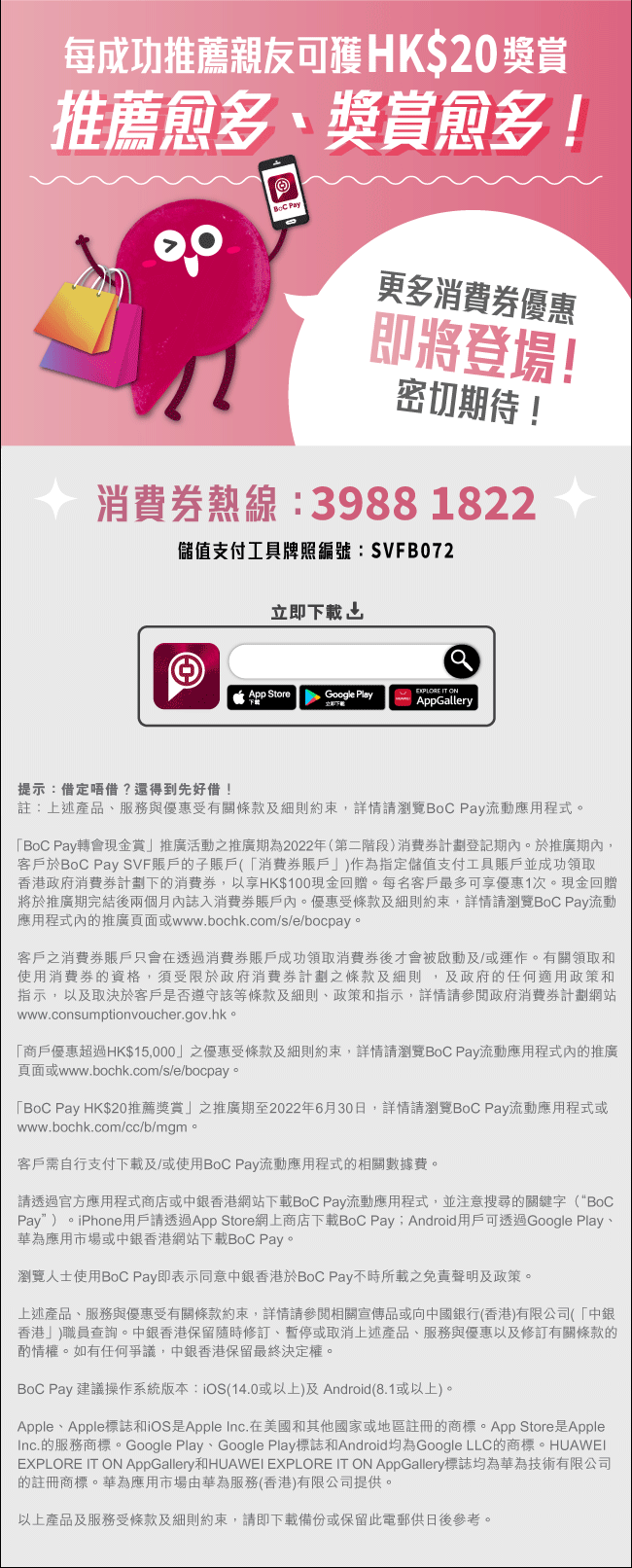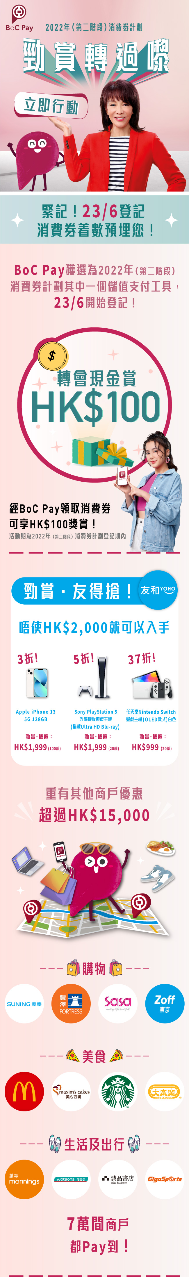 6月23日起經BoC Pay登記消費券,享HK$100現金賞! 立即行動!