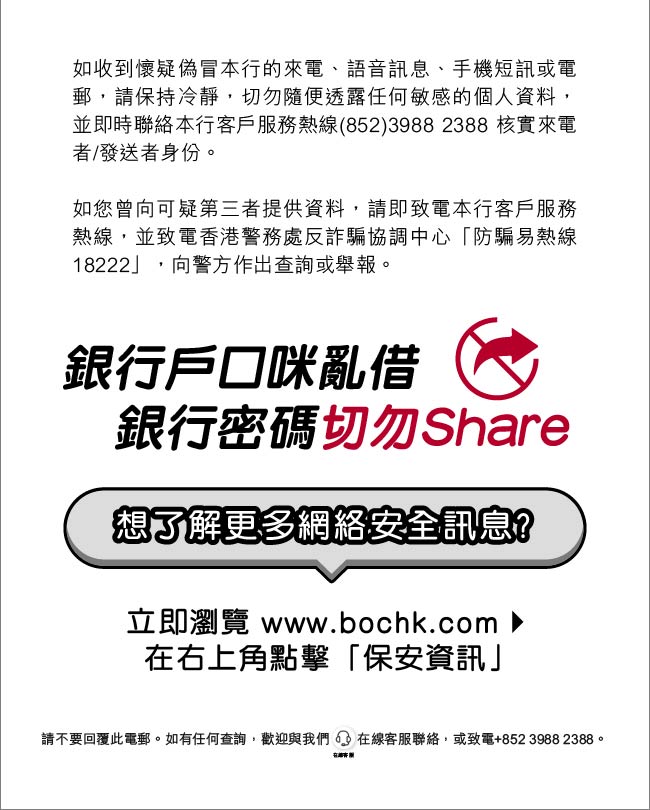 如果您不希望繼續接收本行及中銀信用卡(如適用)的電子宣傳郵件,請按此登記。此項安排無需繳付任何費用。 如果您不希望继续接收本行及中银信用卡(如适用)的电子宣传邮件,请按此登记。此项安排无需缴付任何费用。 If you do not wish to receive future promotional emails from BOCHK and BOC Credit Card (if applicable), please click here. No fee will be charged for this arrangement.