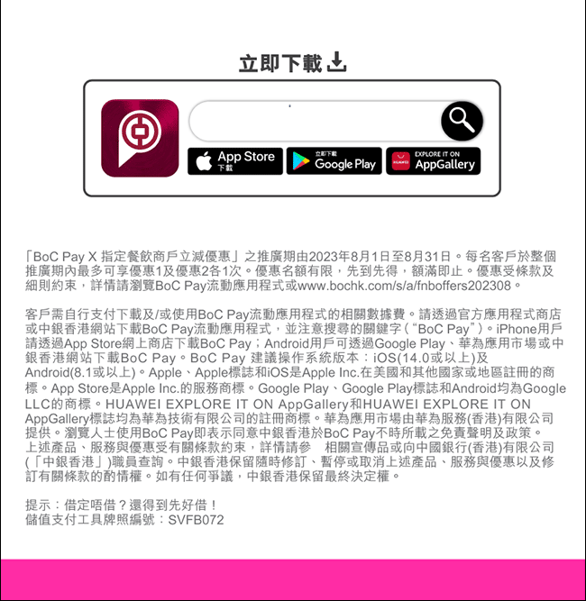 如果您不希望繼續接收本行及中銀信用卡(如適用)的電子宣傳郵件,請按此登記。此項安排無需繳付任何費用。 如果您不希望继续接收本行及中银信用卡(如适用)的电子宣传邮件,请按此登记。此项安排无需缴付任何费用。 If you do not wish to receive future promotional emails from BOCHK and BOC Credit Card (if applicable), please click here. No fee will be charged for this arrangement. |