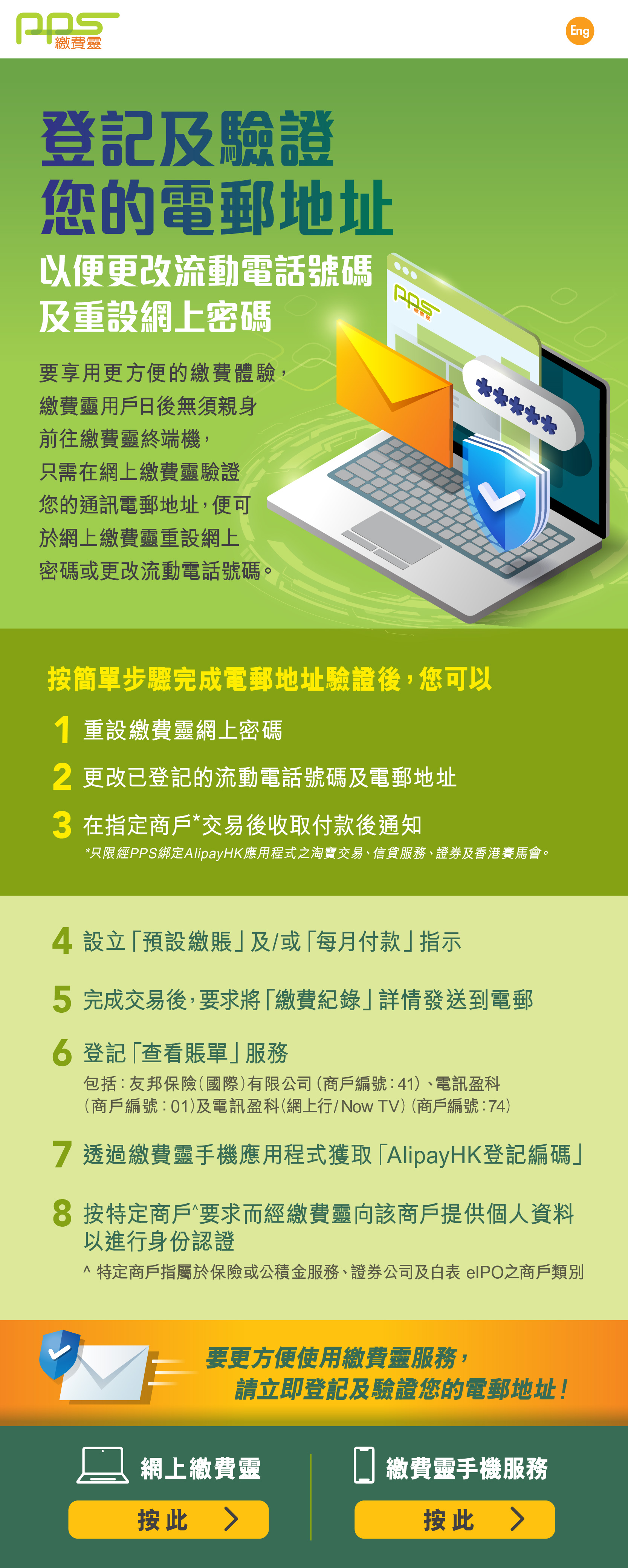 有關繳費靈付款通知之保安提示: ,選擇「戶口設定」>「更改一般設定」>「使用個人資料作直接促銷」>「您的選擇」>「不同意」。你亦可將你的要求電郵至 pps_unsubscribe@eps.com.hk,但請勿於電郵內透露你的PPS戶口號碼、密碼或其他重要個人資料。當我們收到您的要求,我們將會從宣傳電郵名單中刪除您的電郵地址。 如有查詢或要求其他協助,請致電2311 9876聯絡我們。 |