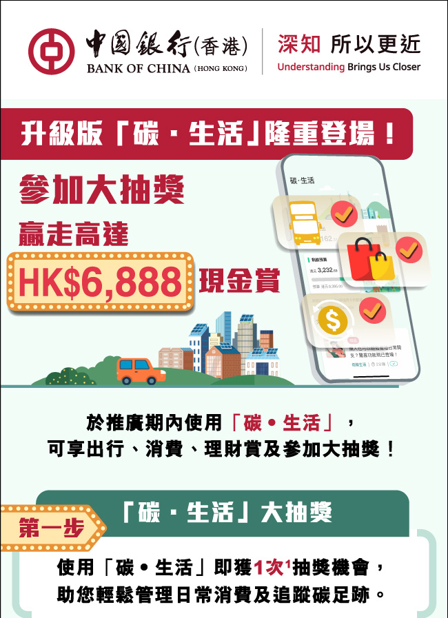 把握時機!立即使用手機銀行「碳·生活」 有機會贏走高達HK$6,888