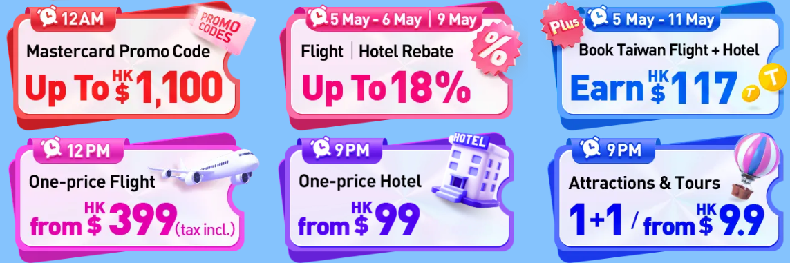 5.5 Mega Sale last chance🚨Book Taiwan flights + hotels to earn HK$117 rebate🤑Grab buy 1 get 1 tickets today🔥Check out more👉