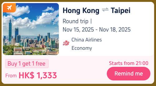11.11 Mega: 9PM Taipei Flight BOGO🎉