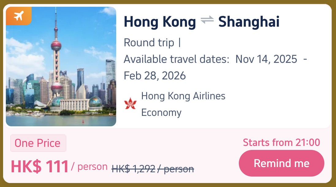 11.11 Mega Last Call‼️HK$111 Shanghai Flight✈️
