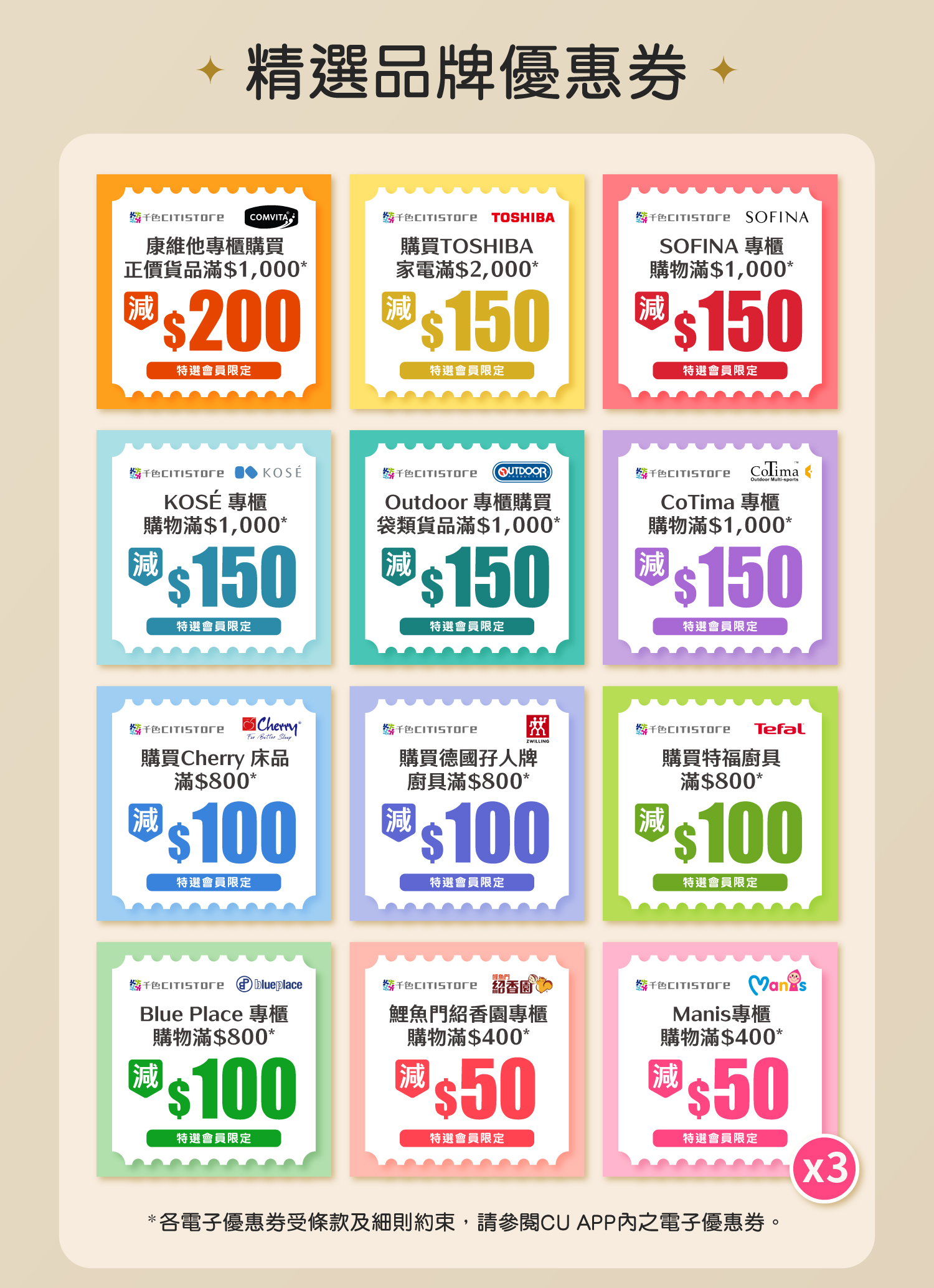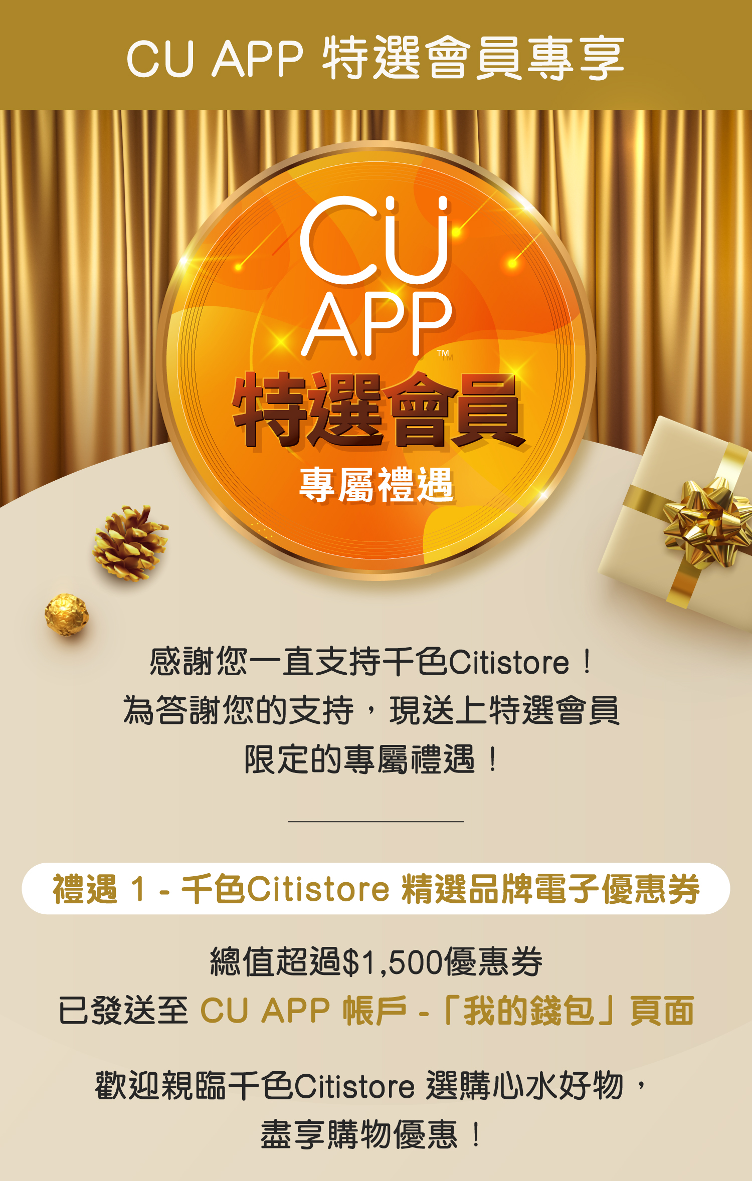 恭喜您!總值超過$1,500 品牌優惠券已發放至CU APP「我的錢包」,歡迎親臨千色Citistore盡享優惠!