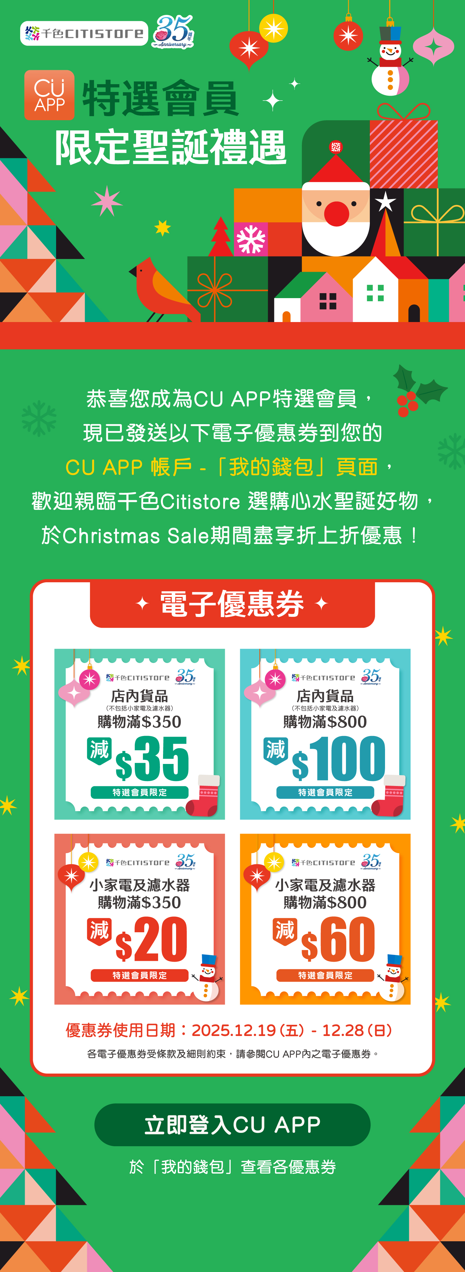 總值超過$200之千色Citistore 電子優惠券已發送至CU APP「我的錢包」!於12月28日或之前,親臨千色Citistore 於聖誕sale盡享折上折優惠!