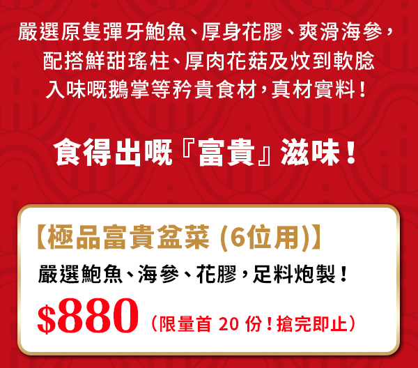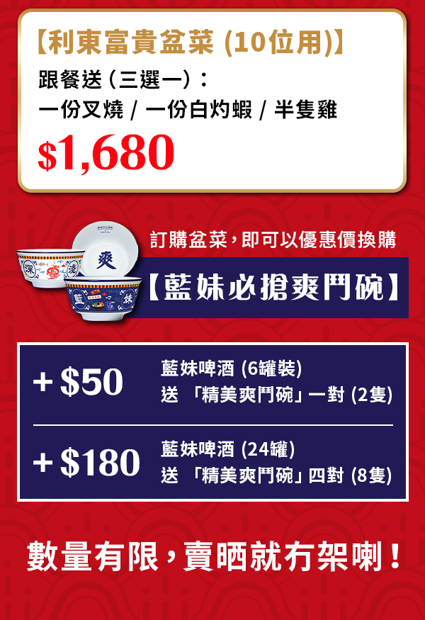 【🔥瘋搶價$880起‼️】利東極品鮑參花膠盆菜🍲 首20名激抵優惠!再加推藍妹啤酒限量「爽鬥碗」換購!🍻