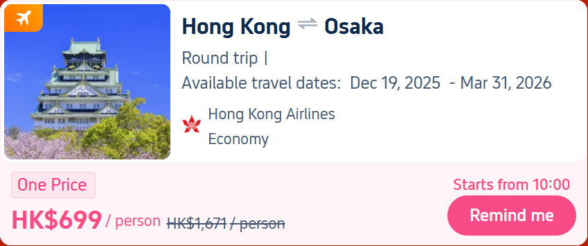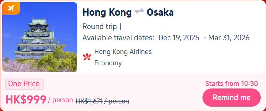 Last call for one-price flight to Osaka from HK$699😽Up to HK$1000 Flight/Hotel promo codes + 8% rebate💎