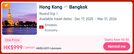 10AM⏰HK$699 round-trip to Bankkok✈️Save HK$800 on Thai F+H🌟Grab your holiday deals👉