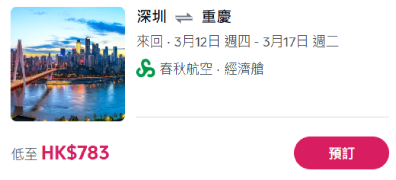 【每週二 10AM 】低至HK$700 來回重慶⁉️